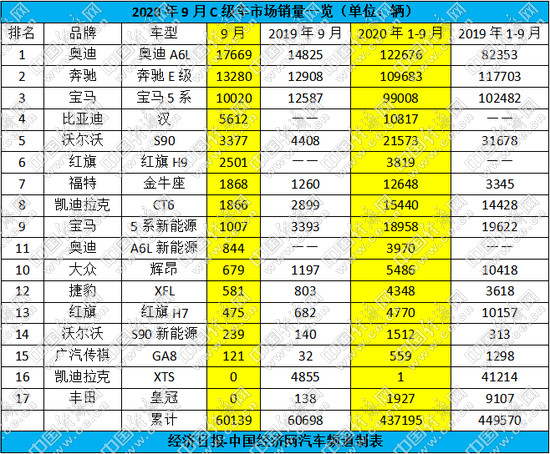 整體來看,9月,國產(chǎn)C級車整體銷量為60139輛,環(huán)比下滑3.2%,與去年同期相比微降0.92%;今年前三個季度的累計(jì)銷量為437195輛,同比下滑2.75%,基本追平去年同期水平。