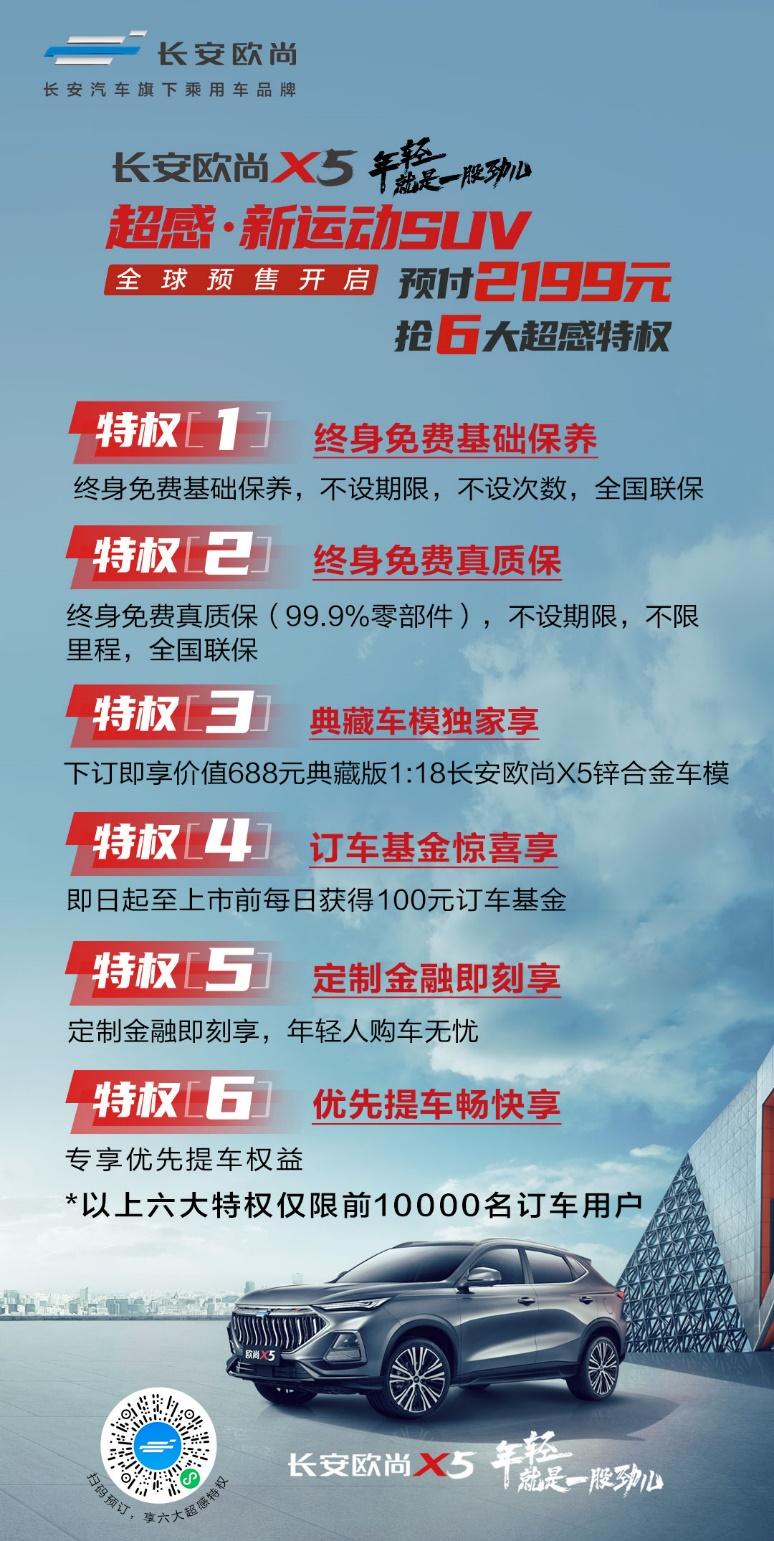 為了讓消費者更加輕松享受品質(zhì)車生活,長安歐尚汽車再亮“底牌”,針對長安歐尚X5預售還推出了誠意滿滿的終身免費維保政策(終身免費基礎(chǔ)保養(yǎng)、終身免費真質(zhì)保)、與下訂即享典藏車模、100元/日訂車基金、定制無憂購車金融政策、專享優(yōu)先提車等六大特權(quán)(2199元下訂,即可搶先獲取6大特權(quán),僅限前10000名訂車用戶),為廣大用戶提供了豐富全面的購車保障。