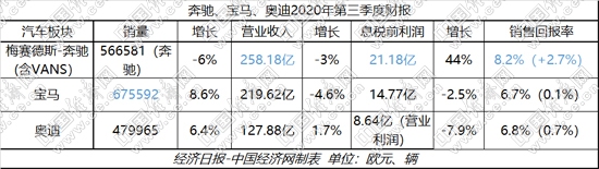 在此帶動(dòng)下,BBA汽車業(yè)務(wù)一改二季度的虧損、下滑,三季度各主要財(cái)務(wù)指標(biāo)均呈現(xiàn)明顯回升,息稅前利潤(rùn)及銷售回報(bào)率等更是實(shí)現(xiàn)由虧損轉(zhuǎn)向盈利,寶馬、奧迪在銷量上也分別達(dá)到8.6%和6.4%的同比正增長(zhǎng)。BBA前三季度各指標(biāo),也因此實(shí)現(xiàn)了一定程度的提升。