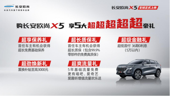 為了能夠讓用戶在用車方面消除后顧之憂,在上市當天,長安歐尚X5還推出了超享保養(yǎng)禮、超長質(zhì)保禮、超級金融禮、超勁煥新禮、超爽流量禮五大超豪禮購車福利,在高價值產(chǎn)品之外,保障每位用戶都能實現(xiàn)輕松購車、省心用車。