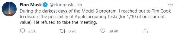 特斯拉CEO馬斯克:曾想讓蘋果收購特斯拉 但庫克拒絕,中國網(wǎng)汽車12月23日訊據(jù)特斯拉CEO埃隆·馬斯克在社交媒體上透露,在Model 3項目最黑暗時刻,馬斯克曾向蘋果CEO庫克討論蘋果收購特斯拉的可能性,但庫克拒絕會面,而當(dāng)時特斯拉的市值只有目前的1/10。