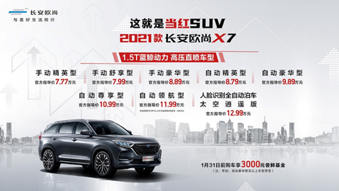12月29日,2021款長安歐尚X7上市,共推1.5T+6MT和1.5T+7DCT兩種動力組合共8款車型,官方指導(dǎo)價7.77萬元-12.99萬元。