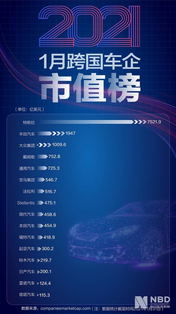隨著近期新能源汽車上市公司股價(jià)的暴漲,特斯拉、蔚來(lái)等行業(yè)新貴再度成為了全球資本追逐的焦點(diǎn)。截至2021年1月31日,特斯拉市值突破7500億美元,為豐田、大眾兩大傳統(tǒng)車企市值總和的2.5倍,CEO埃隆·馬斯克也一度成為世界首富。