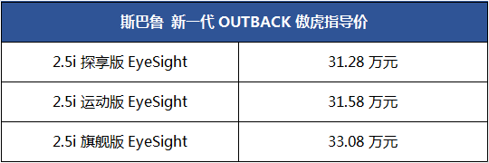 據(jù)了解,新一代OUTBACK傲虎市場指導(dǎo)價(jià)格區(qū)間為31.28萬元-33.08萬元,包括2.5i探享版EyeSight、2.5i運(yùn)動版EyeSight 、2.5i旗艦版EyeSight共3款車型。