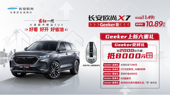 4月9日,長安歐尚X7Geeker版正式上市,市場指導(dǎo)價11.49萬,現(xiàn)在下訂可享上市嘗鮮價10.89萬(即交2000元訂金抵8000元嘗鮮基金)。同時長安歐尚還推出多重上新福利,包含金融貼息7200元、5萬元定額貸、36期0利率、置換補貼4000元、0元換新車,以及可搶4000元購車套裝禮包。
