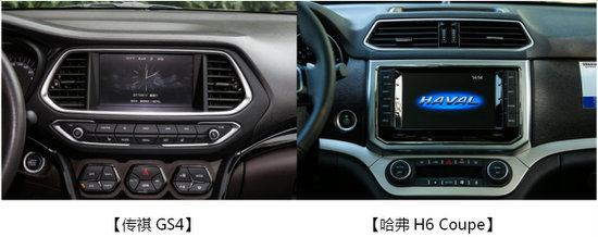 【內(nèi)飾中控】內(nèi)飾方面兩車都采用了搪塑工藝,使得兩款車都有很強(qiáng)的檔次感,哈弗H6 Coupe的內(nèi)飾延續(xù)了外觀簡潔大方的設(shè)計,中控整體以中軸線采用對稱布局,空調(diào)出風(fēng)口、顯示屏、媒體按鍵分區(qū)明顯,商務(wù)科技范兒十足。反觀傳祺GS4,緊湊的布局使按鍵堆積到一起節(jié)省了空間,中控屏和出風(fēng)口結(jié)合在一起使得本就不大的屏幕更加小巧。