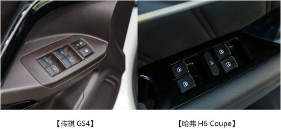 按鍵配置,從圖片可以看出來哈弗H6 Coupe帶車窗4門一鍵升降防夾功能,相比而言傳祺GS4只有駕駛員一側(cè)車窗帶有一鍵升降,稍顯簡陋。