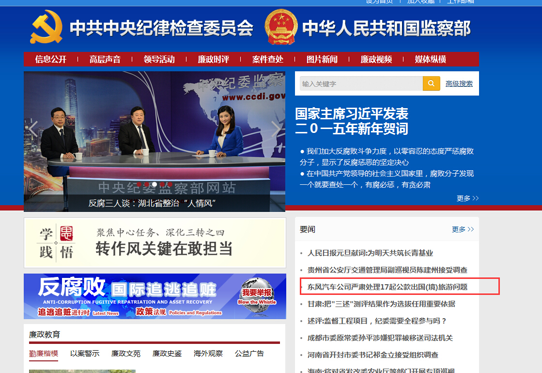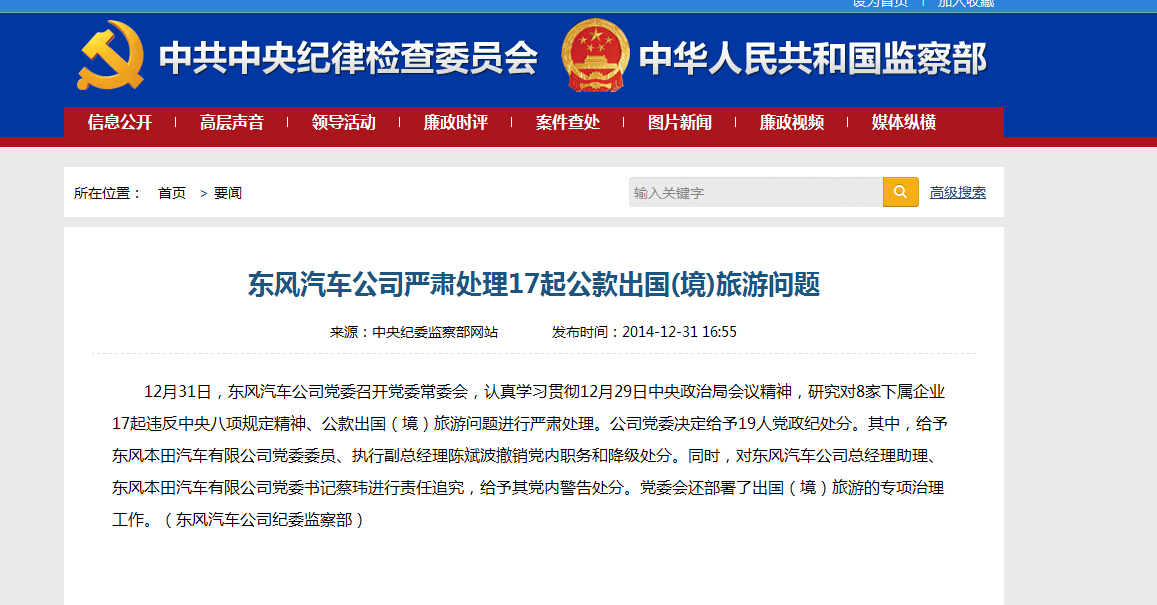 在2014年12月31日,中紀(jì)委網(wǎng)站在要聞區(qū)顯要位置刊登了一則來源東風(fēng)汽車公司紀(jì)委監(jiān)察部的通告,其中東風(fēng)本田汽車陳斌波、東風(fēng)本田黨委書記蔡瑋遭到了黨內(nèi)降職或警告處分。