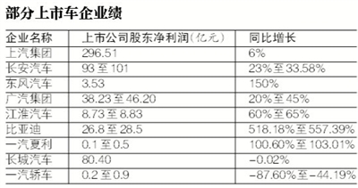 上汽集團及長安汽車兩大汽車集團的業(yè)績表現(xiàn)依舊十分出色。據(jù)上汽集團業(yè)績預告顯示,公司預計2015年年度實現(xiàn)歸屬于上市公司股東的凈利潤將增加6%左右,約為296.51億元。長安汽車則預計2015年實現(xiàn)歸屬于上市公司股東的凈利潤為93億元-101億元,同比上升23%-33.58%。公告顯示,這兩家上市公司的業(yè)績提升,均得益于其整車銷量的增長。另外,數(shù)字顯示,東風汽車、廣汽集團、江淮汽車也均實現(xiàn)業(yè)績增長。