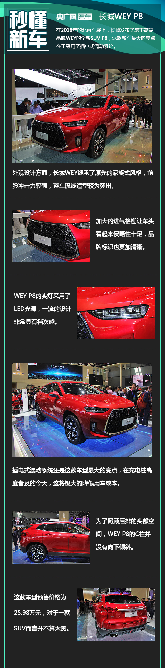 WEY P8上市正式上市 補貼后統(tǒng)一售25.98-27.98萬,【環(huán)球網(wǎng)汽車 新車上市】2018年4月22日,長城旗下WEY品牌首款混合動力四驅SUV——WEY P8正式上市,售價為29.28-31.28萬元,補貼后全國統(tǒng)一售價25.98-27.98萬元。新車基于全新WEY Pi4平臺打造,搭載2.0T直噴發(fā)動機+后軸驅動電機的四驅插電式混合動力總成,定位中型SUV。