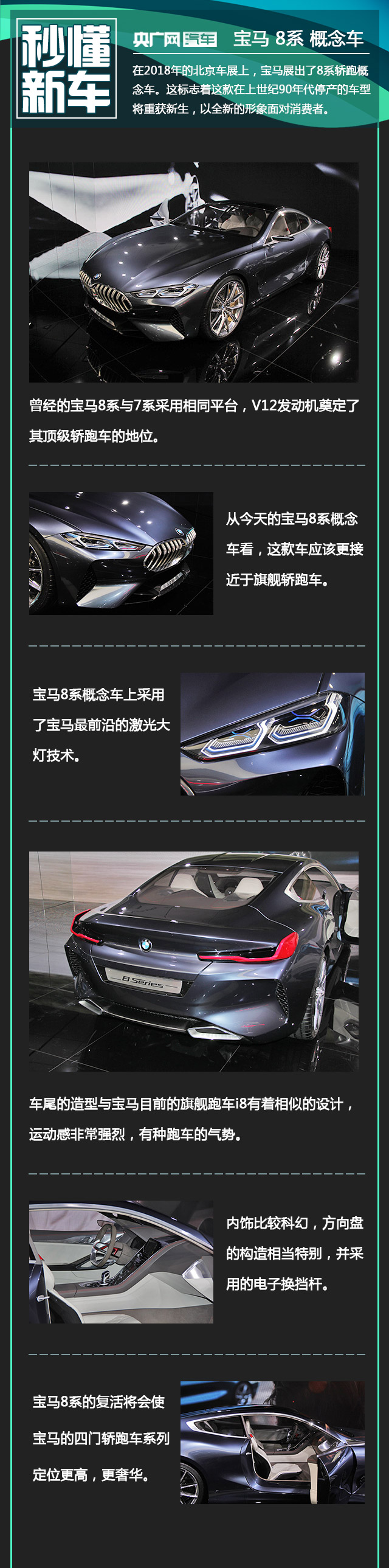 在2018年的北京車展上,寶馬展出了8系轎跑概念車。這標志著這款在上世紀90年代停產(chǎn)的車型將重獲新生,以全新的形象面對消費者。