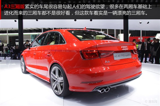 奧迪A3/S3三廂版造型簡約時(shí)尚,動(dòng)感而富有科技感的大燈和質(zhì)感出色的內(nèi)飾都保持了奧迪一貫的水準(zhǔn)。動(dòng)力上,A3有1.4TFSI和1.8TFSI發(fā)動(dòng)機(jī),S3則使用2.0TFSI發(fā)動(dòng)機(jī)。在國內(nèi)消費(fèi)者最看重的空間方面,A3前后排都能比較舒適的乘坐,整體表現(xiàn)與主流10萬元級(jí)相似。國產(chǎn)后或許還會(huì)推出加長版車型。