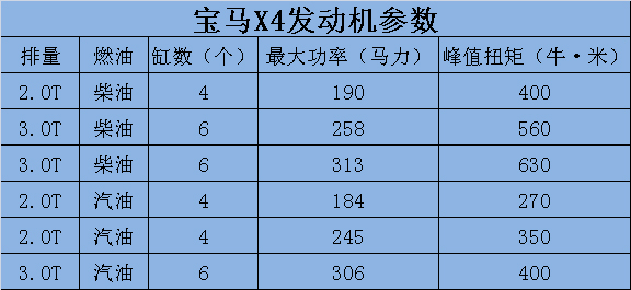 動(dòng)力方面,寶馬X4提供6種不同的動(dòng)力系統(tǒng)供選擇,包括汽油和柴油發(fā)動(dòng)機(jī)各三款,具體參數(shù)如下: