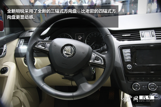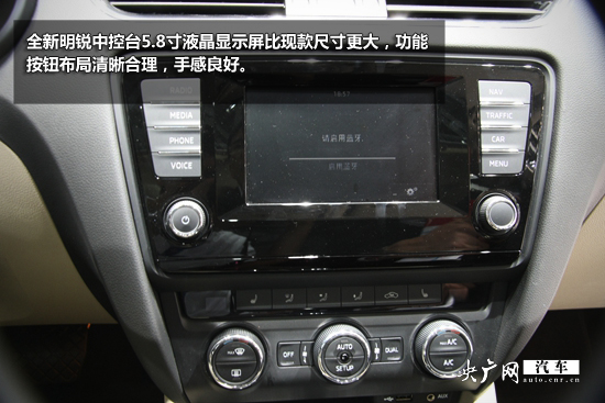 內飾方面,全新明銳內飾質感提升明顯,中控臺5.8寸液晶顯示屏比現(xiàn)款尺寸更大,功能按鈕布局清晰合理,手感良好。新明銳采用了全新的三輻式方向盤,比老款的四輻式方向盤更顯動感。