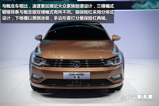 與概念車相比,凌渡更加接近大眾家族臉譜設(shè)計(jì),三橫幅式鍍鉻飾條與概念版雙橫幅式有所不同。前保險(xiǎn)杠采用分體式設(shè)計(jì),下格柵以黑側(cè)涂裝,多邊形霧燈分居保險(xiǎn)杠兩端。前大燈組采用遠(yuǎn)近光一體式氙氣大燈。上海大眾凌渡的單腰線十分干練,多幅輪轂與概念車相比缺少一些運(yùn)動(dòng)風(fēng)。
