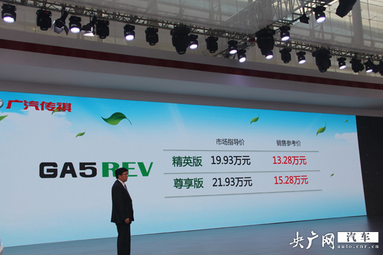 2014廣州車展開幕當(dāng)日,廣汽傳祺GA5 REV增程式電動車正式上市,新車兩款車型精英版和尊享版車型售價分別為19.93萬元和21.93萬元。