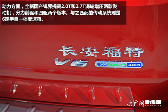 動力方面,全新國產(chǎn)銳界提高2.0T和2.7T渦輪增壓兩款發(fā)動機(jī),分為前驅(qū)和四驅(qū)兩個版本。與之匹配的傳動系統(tǒng)則是6速手自一體變速箱。