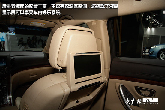 內飾方面與現(xiàn)款變化依舊如出一轍。在自主品牌同級別車中做工用料算是首屈一指。座椅寬大豎式,前排電動調節(jié)按鈕設在座椅側方。后排老板座的配置豐富,不僅有雙溫區(qū)空調,還搭載了液晶顯示屏可以享受車內娛樂系統(tǒng)。