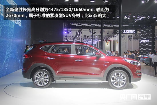 全新途勝長寬高分別為4475/1850/1660mm,軸距為2670mm,屬于標(biāo)準(zhǔn)的緊湊型SUV身材,比ix35略大一些。