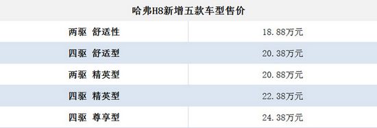 為進(jìn)一步提升哈弗H8產(chǎn)品力,同時(shí)讓更多消費(fèi)者享受到哈弗高品質(zhì)產(chǎn)品,哈弗H8新增5款車型并于廣州車展期間上市。新增車型為兩驅(qū)舒適型、兩驅(qū)精英型、四驅(qū)舒適型、四驅(qū)精英型、四驅(qū)尊享型,新車型上市后哈弗H8售價(jià)區(qū)間為18.88萬(wàn)-24.38萬(wàn)。