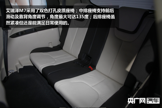 艾瑞澤M7采用了雙色打孔皮質(zhì)座椅,質(zhì)感不錯;中排座椅支持前后滑動及靠背角度調(diào)節(jié),角度最大可達(dá)135度,很人性化,第三排沒有乘客的情況下中排乘客可以享受超大空間。 艾瑞澤M7車內(nèi)座椅布局采用2+3+2設(shè)計,行李箱容積為588升,第二排和第三排座椅放倒后,能擴(kuò)展到2240升,不僅能夠滿足日常出行,裝點貨物也完全沒問題。
