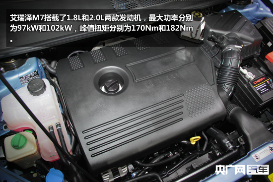 動力方面,艾瑞澤M7搭載了1.8L和2.0L兩款發(fā)動機(jī),最大功率分別為97kW和102kW,峰值扭矩分別為170Nm和182Nm。傳動系統(tǒng),匹配5MT手動變速箱和可模擬7速手動模式的CVT變速箱。