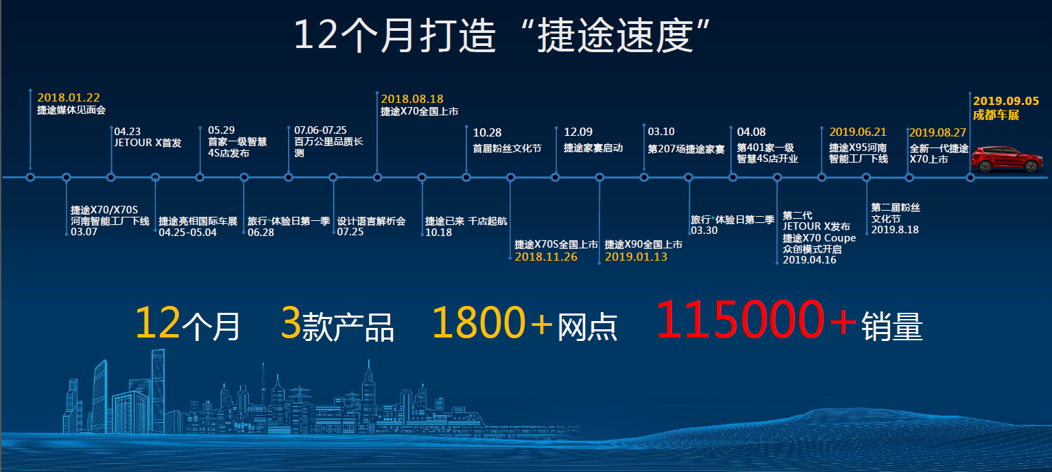 自去年8月首款車型捷途X70上市以來,短短12個月的時間,捷途連續(xù)推出3款熱銷車型,在自主SUV市場增速下滑17%的市場環(huán)境下逆市上揚,急速完成11.5萬輛的銷售規(guī)模。截止目前,捷途網(wǎng)絡(luò)總規(guī)模建成401家一級智慧4S店,1800+網(wǎng)絡(luò)布局,六種渠道模式多樣化布局終端,實現(xiàn)地市覆蓋率91.4%,50公里購車、用車圈不斷夯實。此外,隨著“旅行+”市場的深度挖掘,捷途產(chǎn)品“旅行+”標(biāo)簽及“高大更好”的產(chǎn)品DNA標(biāo)簽也在市場中贏得了用戶的一致認(rèn)可。這一年,捷途在品牌、產(chǎn)品、渠道、“旅行+”生態(tài)圈建設(shè)、服務(wù)等層面取得了優(yōu)異的戰(zhàn)果,不斷上演著“捷途速度”的奇跡。