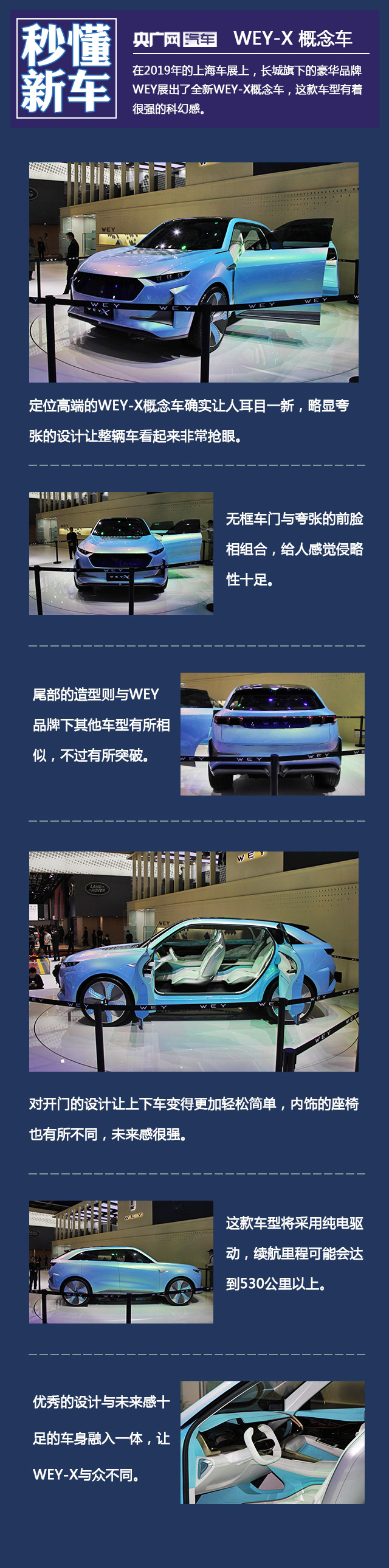 在2019年的上海車展上,長城旗下的豪華品牌WEY展出了全新WEY-X概念車,這款車型有著很強(qiáng)的科幻感。