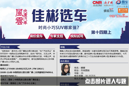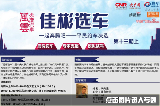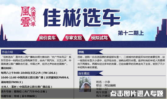 “佳彬選車”是中央人民廣播電臺傾力推出的“央廣汽車風(fēng)云”系列節(jié)目中一檔網(wǎng)臺互動導(dǎo)購類節(jié)目,由央廣網(wǎng)汽車、文藝之聲、中國高速公路廣播聯(lián)合打造,中國之聲、經(jīng)濟之聲協(xié)助全國推廣,同時將在蜻蜓FM、中國廣播radio.cn以及喜馬拉雅網(wǎng)絡(luò)電臺同步上線。