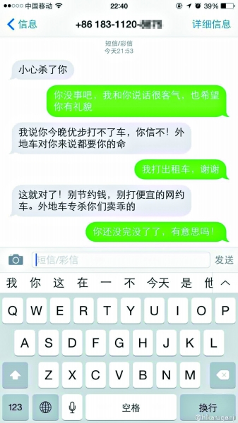 現(xiàn)如今,在北京打到一輛掛著外地牌照的網(wǎng)約車已不是新鮮事兒。家住海淀的李先生稱,他愛人前晚“打優(yōu)步”回家,結(jié)果顯示對方車輛是外地牌照的,考慮到晚上的乘車安全,他愛人取消了這次訂單。沒想到訂單取消后,司機竟發(fā)來了恐嚇短信:小心殺了你。