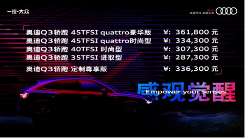 不僅如此,為了滿足消費(fèi)者更為個(gè)性化的需求,一汽-大眾奧迪還推出奧迪Q3轎跑定制尊享版車型,獨(dú)家定制的兼具未來(lái)與質(zhì)感的啞光漆,將為挑剔的顏控一族提供更豐富的選擇。(滿朝旭)