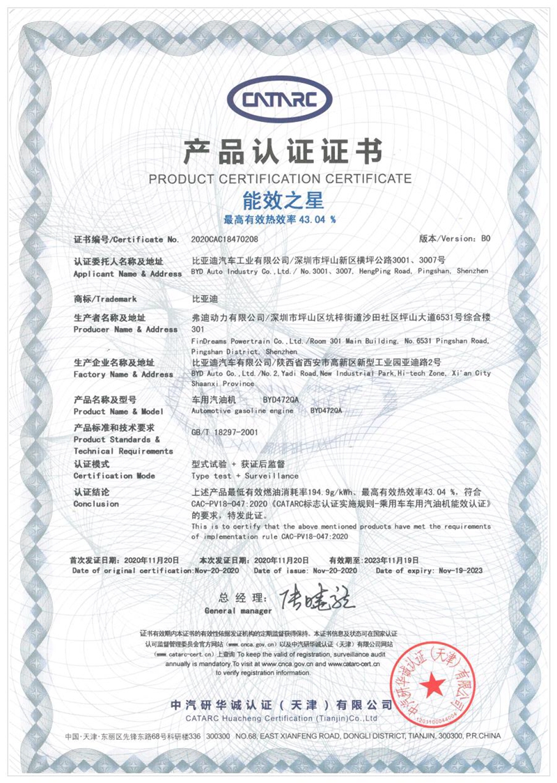 近日,比亞迪驍云-插混專用1.5L高效發(fā)動機獲得了中汽研華誠認(rèn)證中心頒發(fā)的產(chǎn)品認(rèn)證證書,以43.04%的熱效率獲得“能效之星”稱號。同時在廣州車展,比亞迪正式發(fā)布了首款DM-i超級混動轎車秦PLUS,搭載驍云-插混專用1.5L高效發(fā)動機,虧電狀態(tài)百公里3.8L的革命性油耗,在滿油滿電狀態(tài)下行駛里程可超過1000公里,完全顛覆用戶對傳統(tǒng)轎車的油耗認(rèn)知。