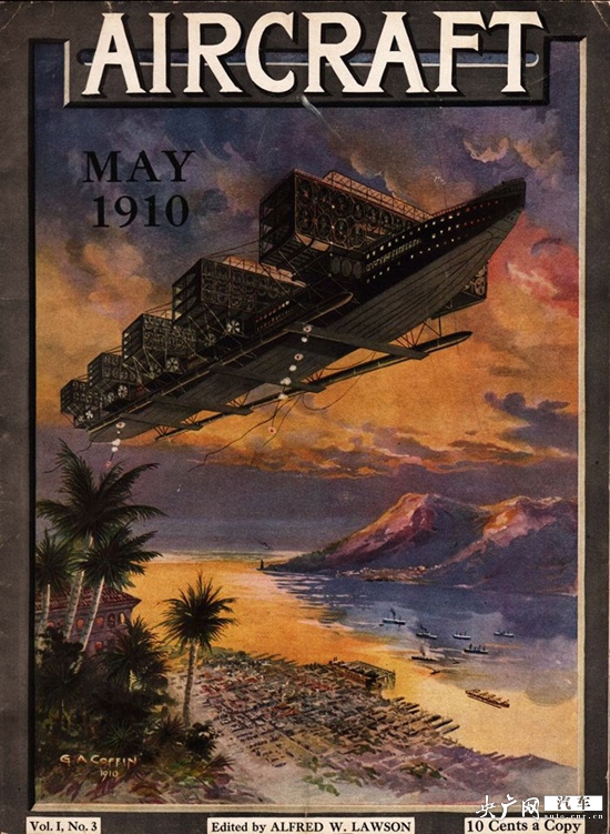 1910年5月期的《飛行器》雜志封面,展示了一種具有未來派色彩的飛行器!讹w行器》雜志在紐約刊印。