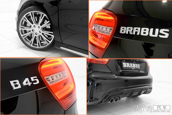 外觀方面,Brabus為奔馳A45 AMG換上了大量的碳纖維材質部件,包括前下擾流板、兩側氣壩、后視鏡、側裙、后下分流器及尾翼部分,車頭的奔馳標志換成了大大的“B”字,但新車沒有像先前CLA45 AMG的改裝車型一樣加入紅色飾條進行點綴。新車還搭配了19寸輪圈。