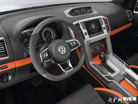 其運(yùn)動(dòng)風(fēng)格延伸至車內(nèi),大眾Amarok Power概念車采用了雙色真皮運(yùn)動(dòng)座椅,Alcantara材料內(nèi)飾以及橙色的細(xì)節(jié)修飾,此外,新車還配有運(yùn)動(dòng)方向盤,及具格調(diào)的中央操控臺等。