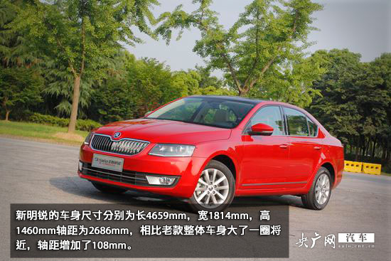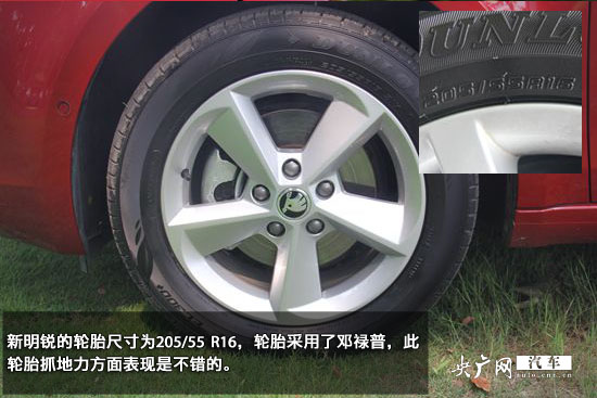 新明銳的車身尺寸分別為長(zhǎng)4659mm,寬1814mm,高1460mm軸距為2686mm,比老款整體車身大了一圈將近,軸距增加了108mm。新明銳的輪胎尺寸為205/55 R16,輪胎采用了鄧祿普,此輪胎抓地力方面表現(xiàn)是不錯(cuò)的。