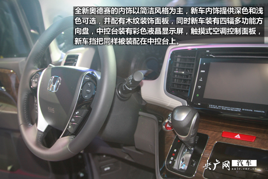 全新奧德賽的內(nèi)飾以簡潔風格為主,新車內(nèi)飾提供深色和淺色可選,并配有木紋裝飾面板,同時新車裝有四輻多功能方向盤,中控臺裝有彩色液晶顯示屏,觸摸式空調(diào)控制面板,新車擋把同樣被裝配在中控臺上,而一鍵啟動按鍵則被設(shè)置在擋把左上方。
