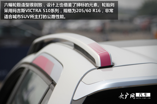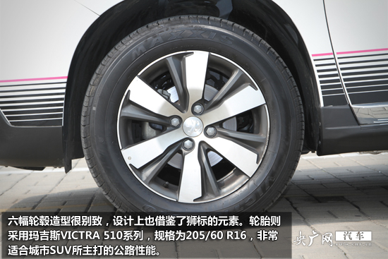 六幅輪轂造型很別致,設(shè)計(jì)上也借鑒了獅標(biāo)的元素。輪胎則采用瑪吉斯VICTRA 510系列,規(guī)格為205/60 R16,非常適合城市SUV所主打的公路性能。
