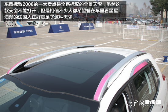 行李架的自然要出現(xiàn)在SUV車型上,而東風(fēng)標(biāo)致2008的一大賣點(diǎn)是全系標(biāo)配的全景天窗,雖然這款天窗不能打開,但是相信不少人都希望躺在車?yán)锟葱切,浪漫的法國人正好滿足了這種需求。