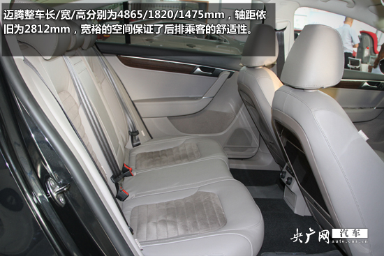 邁騰整車長/寬/高分別為4865/1820/1475mm,軸距依舊為2812mm,寬裕的空間保證了后排乘客的舒適性。