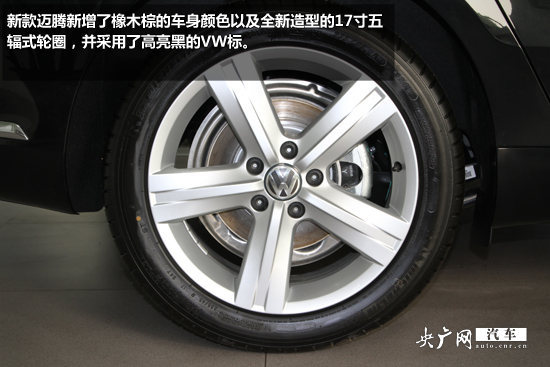 新款邁騰新增了橡木棕的車身顏色以及全新造型的17寸五輻式輪圈,并采用了高亮黑的VW標。