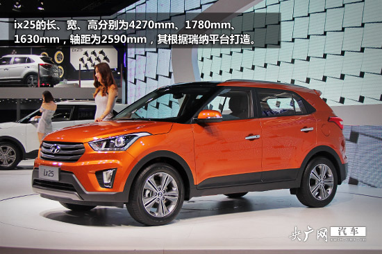 ix25的長(zhǎng)、寬、高分別為4270mm、1780mm、1630mm,軸距為2590mm,其根據(jù)瑞納平臺(tái)打造。整輛車(chē)雖小,但看起來(lái)卻蓄勢(shì)待發(fā),力量感十足。作為一輛SUV車(chē)型,ix25車(chē)身側(cè)面的踏板更顯硬派氣息。
