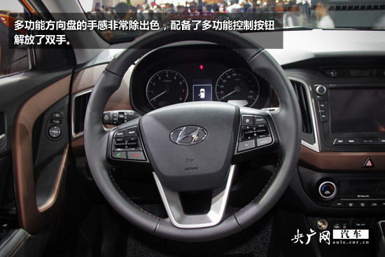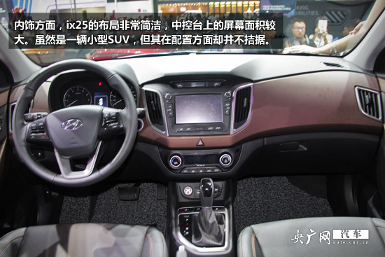 內(nèi)飾方面,ix25的布局非常簡(jiǎn)潔,中控臺(tái)上的屏幕面積較大。雖然是一輛小型SUV,定位也比較經(jīng)濟(jì),但其在配置方面卻并不拮據(jù),自動(dòng)空調(diào)、一鍵啟動(dòng)等配置都有裝備,優(yōu)勢(shì)還是相對(duì)來(lái)說(shuō)比較明顯的。