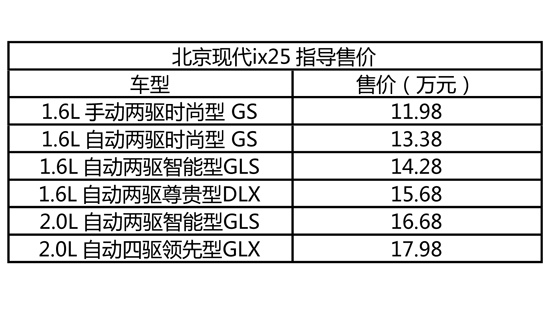 北京現(xiàn)代ix25量產(chǎn)版車(chē)型繼今年成都車(chē)展亮相后,于今日正式上市。其售價(jià)區(qū)間為11.98萬(wàn)元-17.98萬(wàn)元之間。具體車(chē)型及價(jià)格如下: