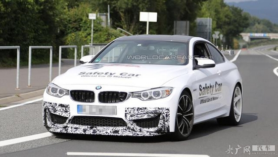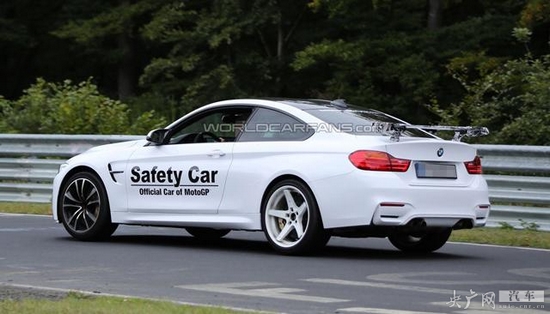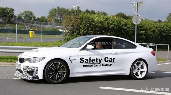 此次曝光的寶馬M4 GTS路試車貼有Moto GP(國際摩托車賽事)安全車的車貼,但我們猜測這款路試車實際上是基于標(biāo)準(zhǔn)版寶馬M4開發(fā)而來的輕量化版本。從諜照看,新車配有更加夸張的前包圍套件以及固定尾翼。