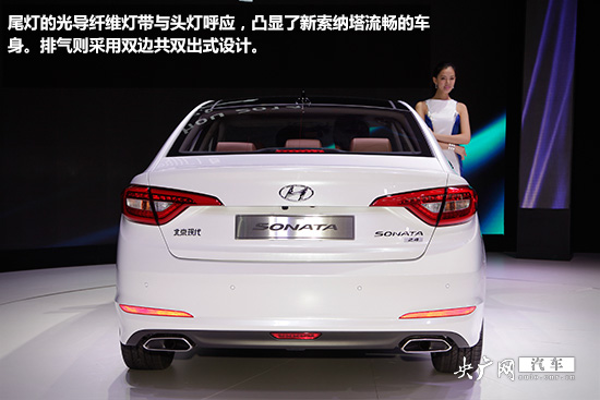 頭燈采用遠(yuǎn)近光一體式燈組,光導(dǎo)纖維日間行車燈是設(shè)計(jì)上的一大亮點(diǎn)。輪轂造型也很有特點(diǎn)。尾燈的光導(dǎo)纖維燈帶與頭燈呼應(yīng),凸顯了新索納塔流暢的車身。排氣則采用雙邊共雙出式設(shè)計(jì)。
