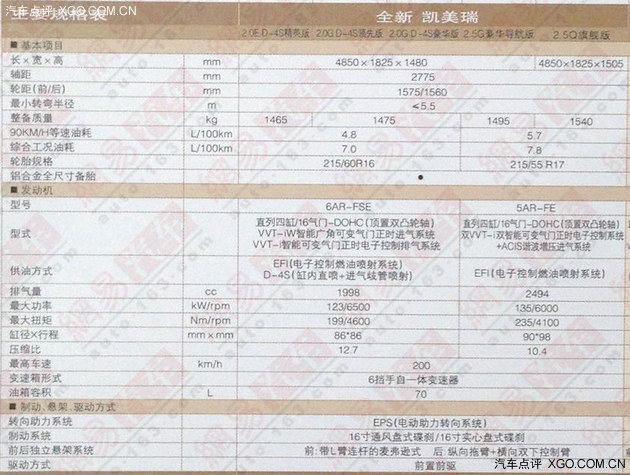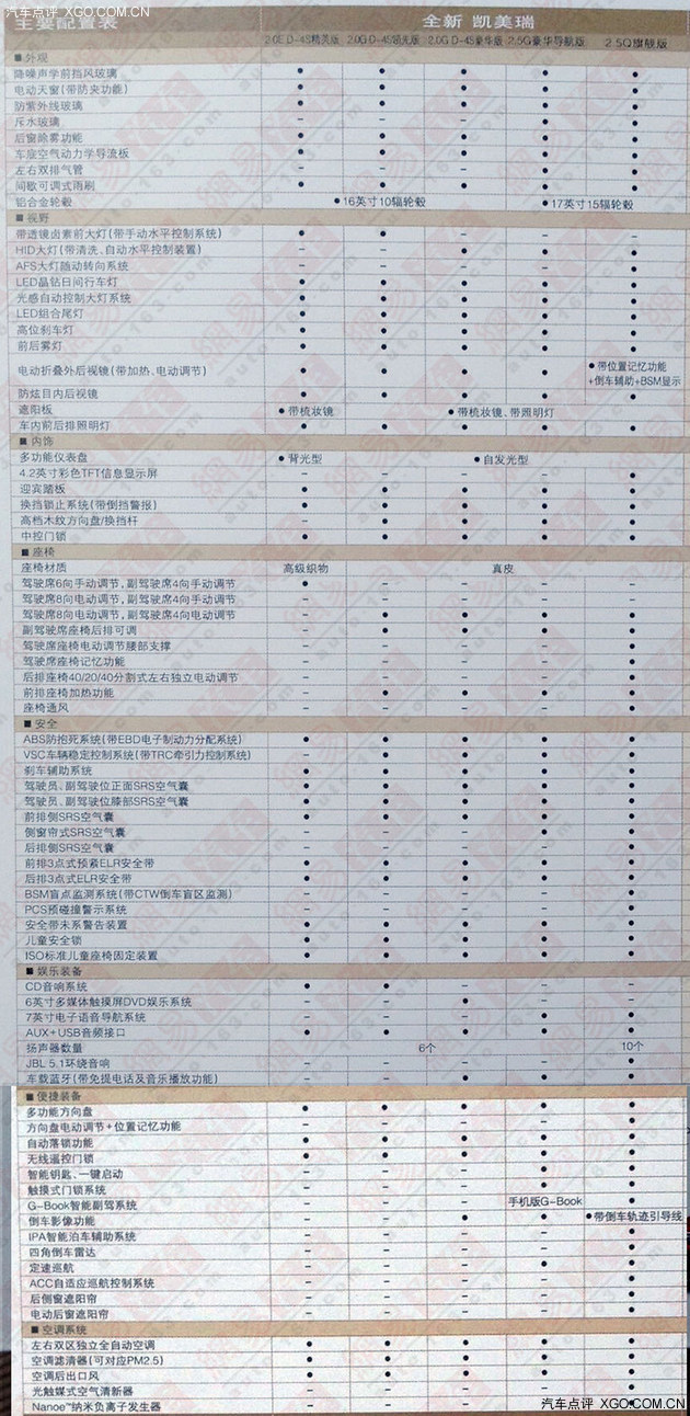 廣汽豐田新款凱美瑞已經正式發(fā)布,新款車型將在2014年12月陸續(xù)到店,并于2015年1月正式上市。近日,我們從相關渠道獲得了新款凱美瑞的詳細配置