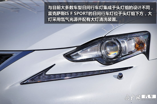 與目前大多數(shù)車型日間行車燈集成于頭燈組的設計不同,雷克薩斯IS F SPORT的日間行車燈位于頭燈組下方,大燈采用氙氣光源并配有大燈清洗裝置。