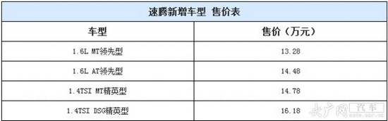 2015年1月4日,一汽-大眾為新速騰車型增加四款新選擇,分別為1.6L MT領(lǐng)先型、1.6L AT領(lǐng)先型、1.4TSI MT精英型和1.4TSI DSG精英型,售價(jià)區(qū)間為13.28-16.18萬(wàn)元。