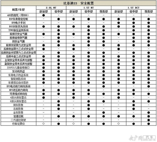 安全配置方面,比亞迪S3全系標配了剎車優(yōu)先系統(tǒng)、前排雙安全氣囊、前排預(yù)緊限力式安全帶、發(fā)動機防盜、智能鑰匙和車速感應(yīng)自動落鎖等。除入門級的2.0L MT舒適型外,全系其他車型均裝配了ESP電子穩(wěn)定程序和定速巡航系統(tǒng)。原廠預(yù)裝的行車記錄儀也體現(xiàn)了人性化和實用性方面更貼心的考慮。